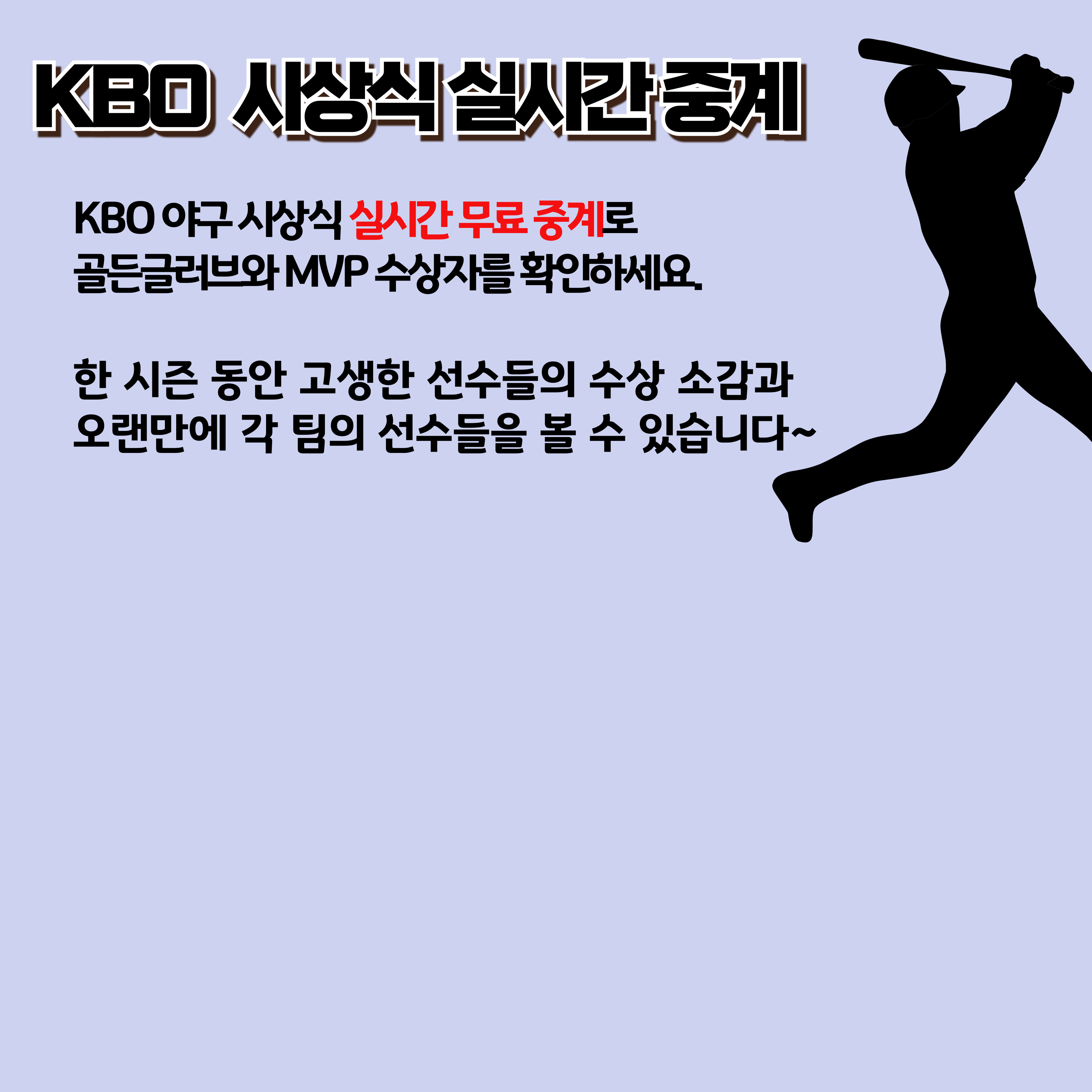 KBO 시상식 실시간 중계보기 방법 안내드립니다. TV로 시청하는 경우 채널번호를 확인하시기 바랍니다. 모바일로 시청하는 경우 링크를 통해 온에어 바로 보기를 진행할 수 있습니다. 실시간 중계 바로보기 모바일 중계 보기 TV 중계 채널번호 확인
